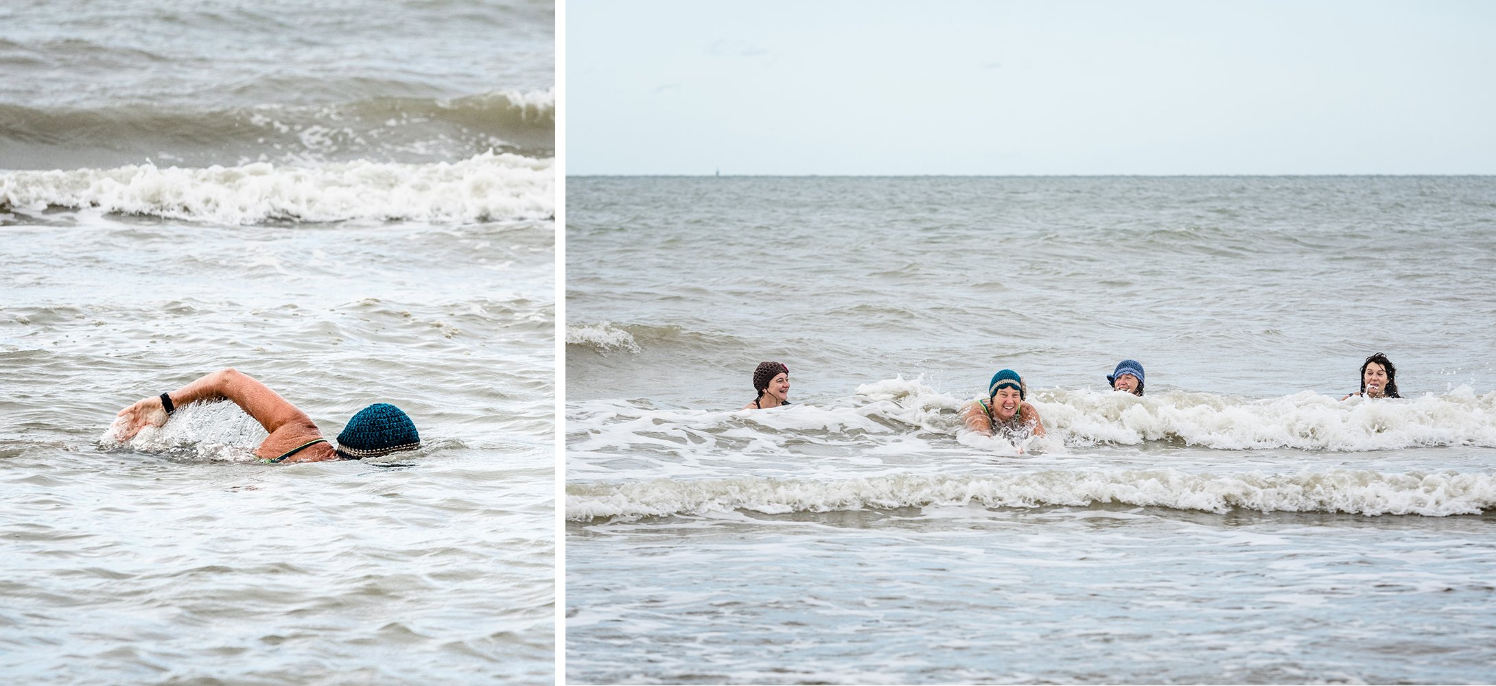 Hop, c’est parti. Un peu hésitantes au début, elles y vont bientôt à pleins poumons. Elles sautent dans les vagues, se laissent un peu dériver, Haïke nage même quelques longueurs tandis que les trois autres prennent position selon la ligne de marée telles des sirènes. Après exactement une heure, tout le monde sort de l’eau et retourne rapidement à la cabane.