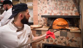Enzo est pizzaiolo. Il presse la boule de pâte en un disque homogène, qu’il garnit d’ingrédients. D’abord, il étale la sauce tomate – fraîchement préparée à base de tomates locales – à la cuillère. Ensuite, il saupoudre la pizza de basilic et la couvre de rondelles de mozzarella. Un filet d’huile d’olive couronne le tout, et le fornaio prend le relais. Celui-ci glisse la pizza dans un four à bois chauffé à 425 degrés Celsius, dont les braises brûlantes ont été ramenées sur un côté. Une demi-minute plus tard, il pivote la pizza de deux quarts de tour, pour qu’elle puisse cuire de façon homogène. Il tapote ensuite deux fois habilement avec la longue pelle à pizza, et le tour est joué. L’art de la pizza, c’est à la fois une science moderne et des gestes transmis de génération en génération.