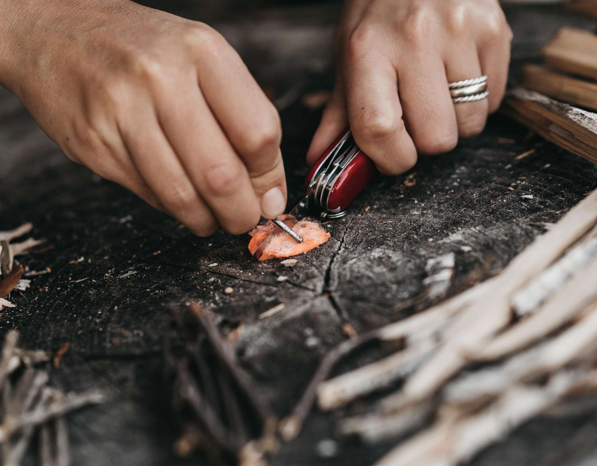 • Zorg voor brandbaar materiaal om je vuur mee te starten. Berkenbast is bijvoorbeeld een goede brandstof.